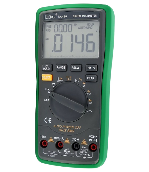 Мультиметр цифровой BAKU BA-28 предназначен для измерения переменного, постоянного напряжения и тока, сопротивления. Прибор оснащен большим и контрастным дисплеем который не вызывает напряжения глаз при чтении результатов измерения.